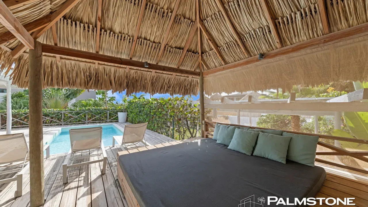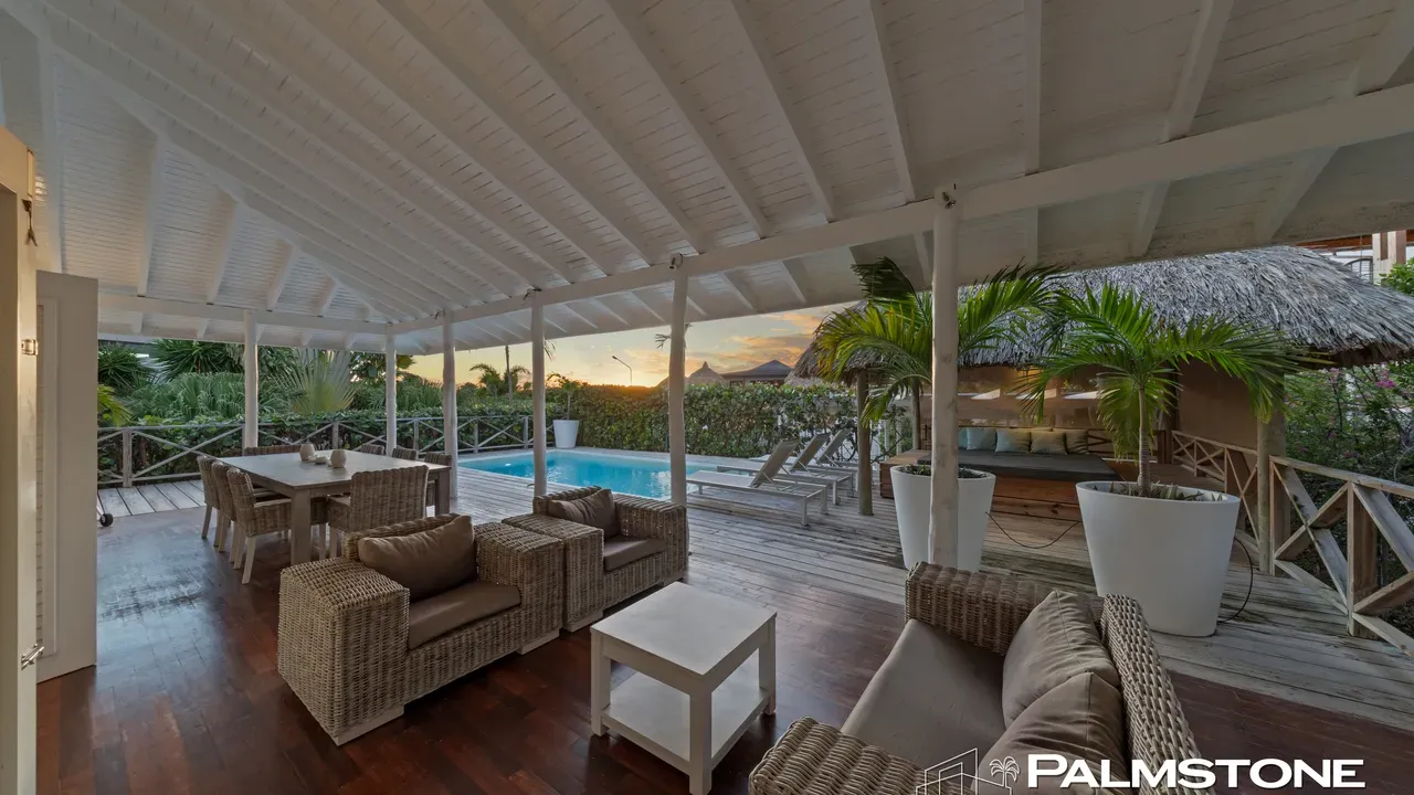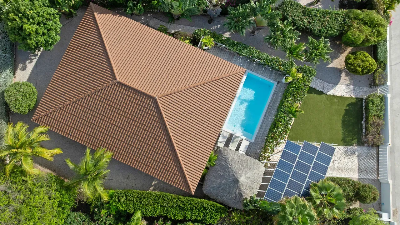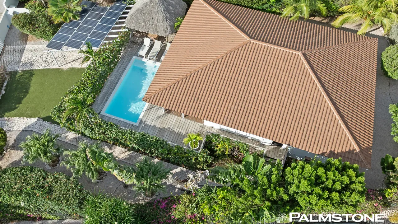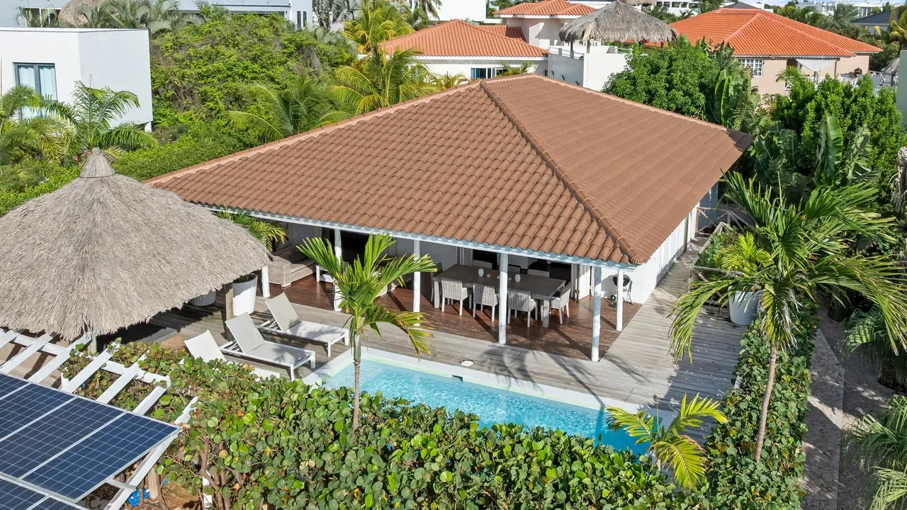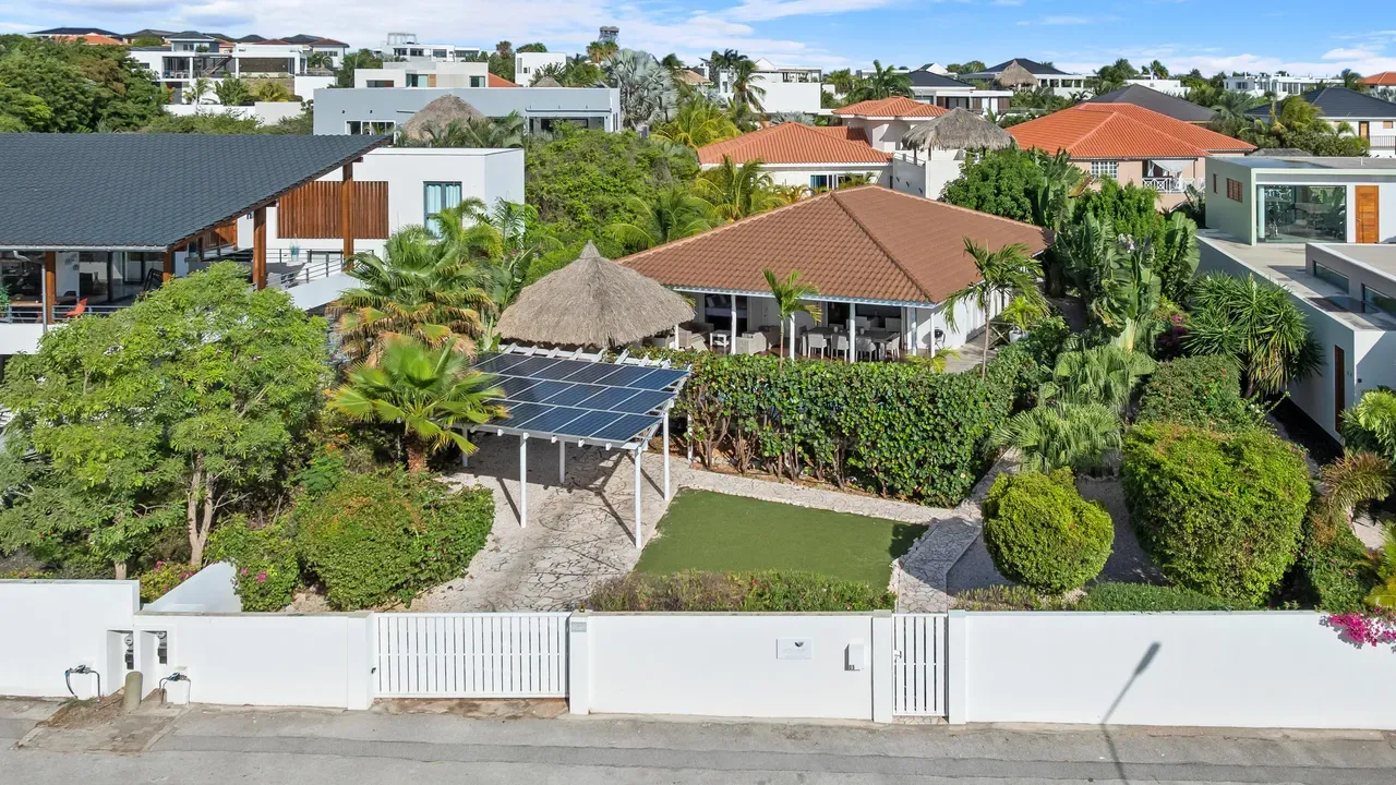 Exclusive Villa in Vista Royal – Jan Thiel 3 Bedrooms | 3 Bathrooms | Private Pool | Palapa | High Tropical Roof | Air Conditioning | Solar Panels Welcome to the pinnacle of tropical living on Curaçao. This exquisite villa, located in the prestigious Vista Royal neighborhood, offers unmatched luxury, space, and privacy — just 500 meters from the vibrant and secure Jan Thiel Beach. The residence features three elegant bedrooms, each with its own stylish en-suite bathroom. The expansive living area is crowned by a soaring tropical ceiling, creating an atmosphere of openness and refined grandeur. Striking accordion doors open completely to the sun-drenched terrace and private pool, surrounded by lush mature landscaping — your personal oasis of peace and sophistication. Beneath the thatched palapa, enjoy the perfect combination of shade, privacy, and views of the beautifully landscaped garden and sparkling pool — ideal for relaxed afternoons or elegant sunset gatherings. Equipped with solar panels, the villa combines luxury with sustainability. All bedrooms are air-conditioned, ensuring year-round indoor comfort, even on the warmest island days. Situated in a prime location, the villa is just a short stroll from Jan Thiel Beach, home to colorful coral reefs, high-end beach clubs, and popular restaurants such as Zanzibar, Zest, Koko’s, Tinto, and Agave. Supermarkets, fitness centers, dive schools, and wellness facilities are also just around the corner. Turn-key, sustainable, and exceptionally located — this is Caribbean living at its finest. Your dream villa is waiting. Come experience it yourself. Schedule a viewing today.