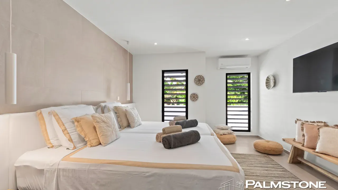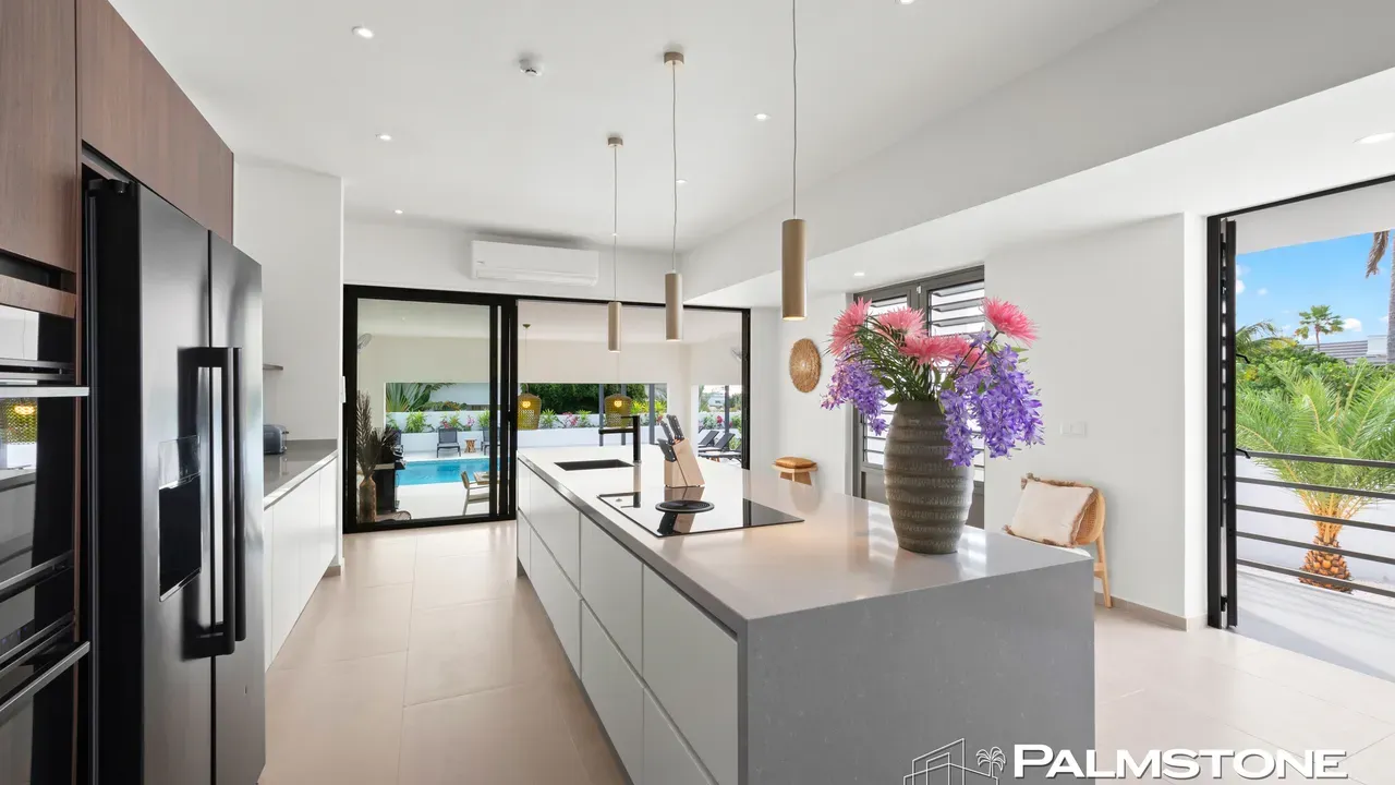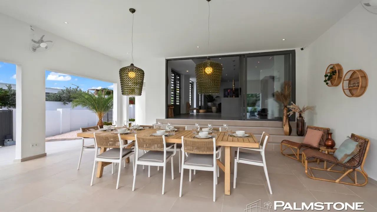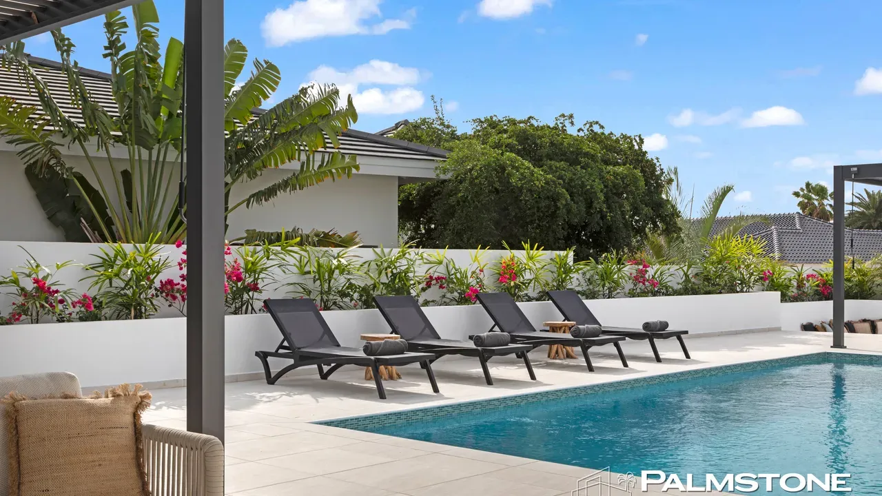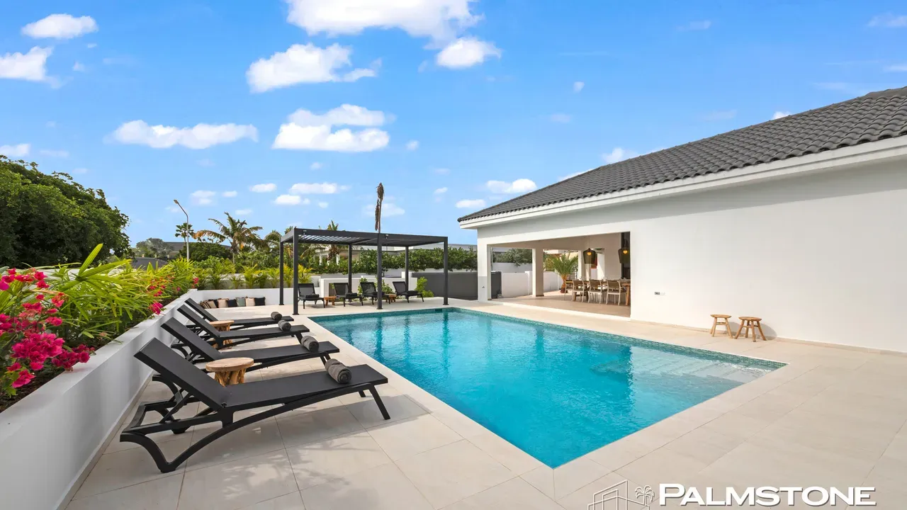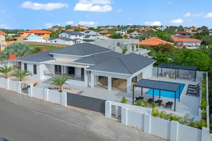 Elegance and Exclusivity Within Walking Distance of Jan Thiel Beach Nestled in a prime location, just a short stroll from the world-renowned Jan Thiel Beach in the sought-after Vista Royal district, we proudly present this fully renovated, single-level villa. This architectural masterpiece, meticulously transformed in 2024, is situated on a generously sized corner lot and exudes luxury, comfort, and sophistication. The villa features four spacious and elegantly designed bedrooms, each with its own en-suite bathroom, offering the ambiance of a high-end boutique hotel. The master suite serves as a true sanctuary, boasting a spa-inspired bathroom with a freestanding bathtub, an expansive walk-in shower, and carefully curated premium finishes. The living area radiates unmatched allure, highlighted by impressive floor-to-ceiling glass sliding doors that seamlessly connect the indoors with the lavish outdoor terrace. The expansive chef’s kitchen is both a visual and functional delight, equipped with a central cooking and prep island with a bar section, built-in state-of-the-art appliances, and sleek, modern finishes. A separate laundry room and an elegantly designed guest toilet complete the interior. The exterior is nothing short of a private paradise, featuring a generously sized swimming pool flanked by two palapa lounges, a cozy sunken seating area with lounge sofas, and a beautifully landscaped garden. The property is fully enclosed with a stylish boundary wall and an electric entry gate, offering ample parking space for multiple vehicles. For your peace of mind, the villa is equipped with a cutting-edge alarm system and camera surveillance. This exceptional property offers an unparalleled blend of luxury, comfort of living and top-tier craftsmanship in a prime location. We warmly invite you to experience this exclusive villa in person. Contact us today to schedule a private viewing and allow yourself to be captivated by this oasis of refinement and comfort.